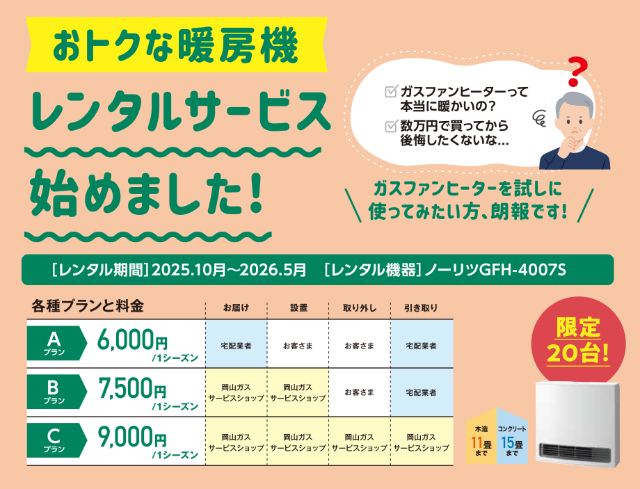 20台限定『ガスファンヒーターレンタルサービス』を始めました。