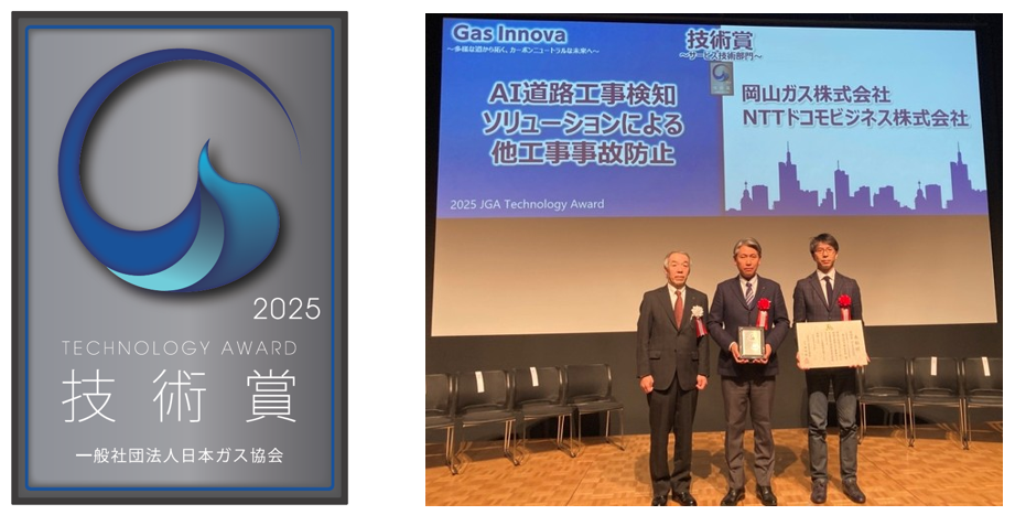 岡山ガス株式会社は、NTTドコモビジネス株式会社と共同開発した「AI道路工事検知ソリューションによる他工事事故防止」の取り組みが評価され、一般社団法人日本ガス協会が主催する2025年度技術賞(サービス技術部門)を受賞しました。